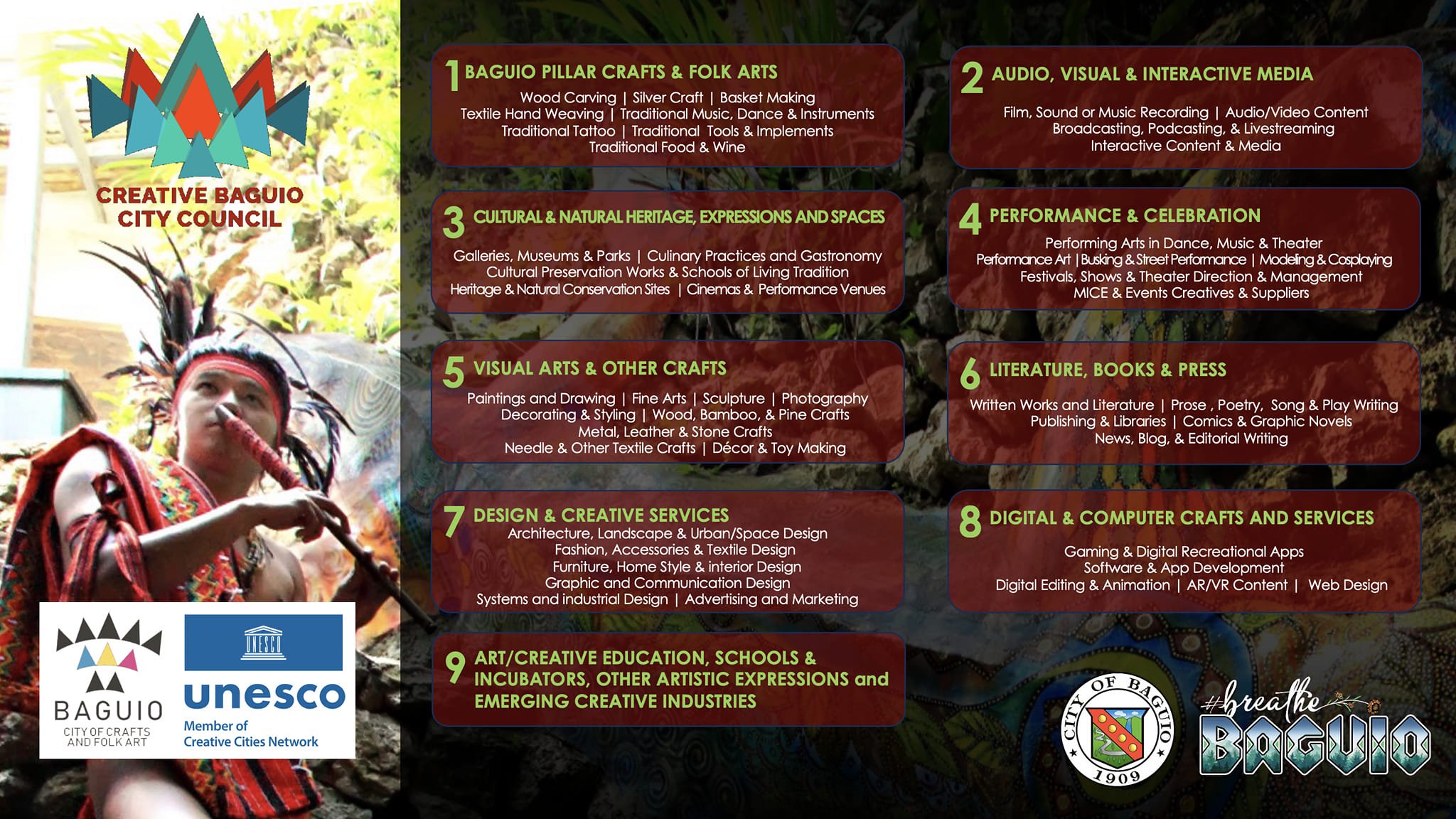 There are 8 various sectors included: Baguio Pillar Crafts & Folk Arts, Visual Arts & Other Crafts, Design & Creative Services, Performance & Celebration, and many more. Whether your creativity is lined in writing, visual arts, or performing, even in digital design or editing, there is certainly a space for you here in our community!